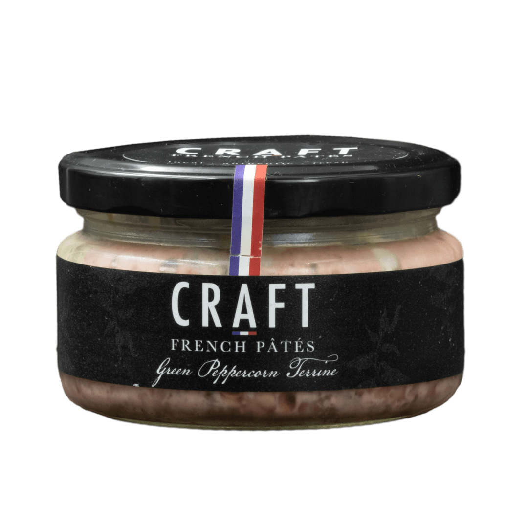 Traditional course textured terrine made with chicken liver and shredded pork meat, accentuated by whole green peppercorns. Delicious with a salad of bitter greens and a big dollop of French mustard.
